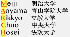 如今正值陽春三月,而三月的英文單詞正是MARCH,小編今天就來給大家介紹一下在日本關東區(qū)內僅次于最難關私立大學群【早慶上理ICU】的關東中堅私立大學群-MARCH:明治大學、青山學院大學、立教大學、中央大學、法政大學五所大學。MARCH這個名字,最早是由日本雜志《螢雪時代》的主編代田恭之提出的。由于日本大學的合格發(fā)布時間大多數(shù)都在每年的三月,而MARCH又是這五所人氣名校的日文羅馬音首字母的合寫,因此索性就使用三月的英文單詞來作為它們的昵稱。(圖:MARCH為對應名校名稱縮寫)由這五所大學組成的關東中堅私